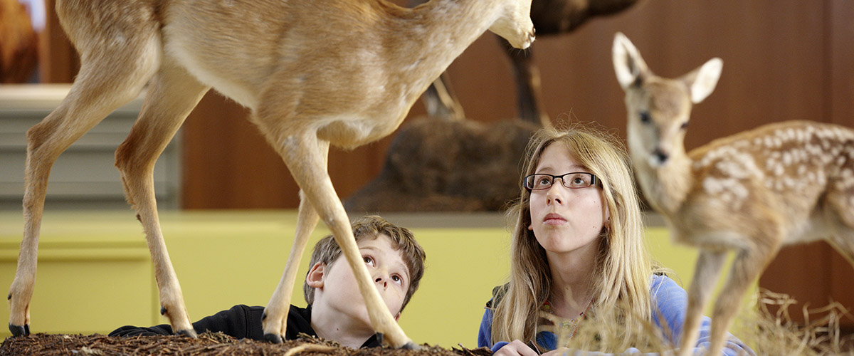 Im Museum kannst du viele Tiere ganz nah erleben – von denen, die heute hier leben, bis hin zu denen, die vor Millionen von Jahren hier waren. Du kannst zum Beispiel das Gewicht der grossen Hörner eines Steinbocks spüren, einem Waldkauz in die Augen schauen oder einen Braunbären aus der Nähe beobachten. Ein echter Hingucker ist die Gruppe Steinwild, die auf einem Felsen steht, und der grosse Rothirsch, der auf dem Waldboden liegt.