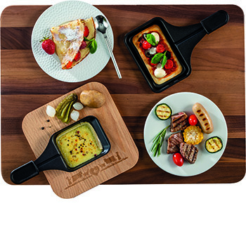 - Variabel: 8 Pfännchen für Raclette, 6 Pfännchen für Pizza (für jeden Einsatz dank verschiedenen Grössen der Pfännchen für Pizza und Raclette), 8 Schaber, 1 Teigausstecher