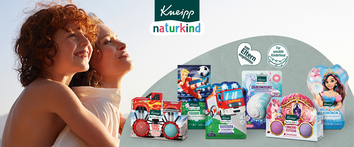 Grosser Badespass mit Kneipp® naturkind! Neuheiten und beliebte Klassiker sorgen für fröhliche Glücksmomente in der Badewanne. Die Sprudelbäder Turbotruck, Zaubermuschel und Einhornkutsche färben das Wasser fröhlich-bunt. Die Schaumbäder Tatütata und Wolkenkönigin pflegen zarte Kinderhaut mit wertvollem Jojoba-Öl. Ein Highlight sind die Badekristalle + Konfetti Tooor! – für viel Badespass während der WM!